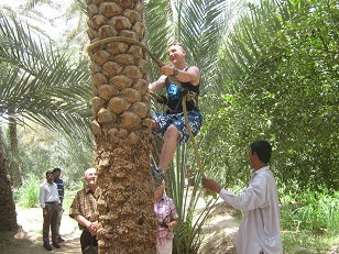 Местный юноша показал нам, как собирают финики. Он завязывает петлю из потрепанных веревок между собой и пальмой. Влезает на дерево. Упрется ногами в ствол – перекинет петлю выше. Откинется назад, петля его держит – поднимает ноги выше. Сверху умелец кидал нам спелые плоды.