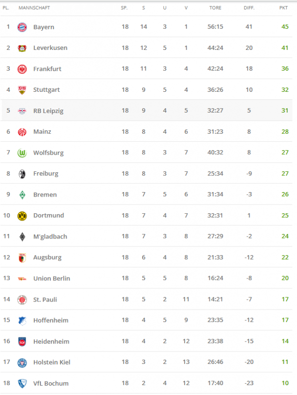 Победы «Аугсбурга» и «Униона», можно сказать, перевели их в статус середняков. «Хоффенхайм» и «Санкт-Паули», выиграв свои матчи, несколько перевели дух, слегка отстранившись от опасного 16-го места. Позиции «Киля» и «Бохума» внешне выглядят безнадежными, но, как отчаянно эти аутсайдеры «бьют лапками», вызвыает уважение и дает какую-то надежду.
