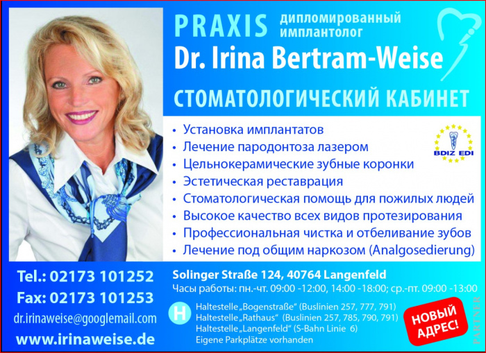 СТОМАТОЛОГ в Германии. Зубной врач. Zahnarzt -> Zahnarztpraxis Dr. Irina Bertram-Weise. Русскоязычный стоматолог в Лангенфельде. Имплантология. Протезирование. Лечение пародонтоза. Стоматология для пожилых