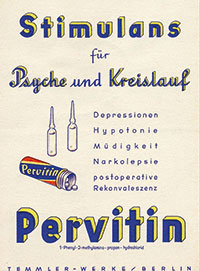 В 1938 г. в Германии на афишных тумбах, столбах, стенах домов и даже в метро появились плакаты, рекламирующие новые чудо-таблетки под названием первитин. Реклама обещала, что после приема этих таблеток у человека буквально вырастают крылья, он начинает испытывать чувство радости, повышается работоспособность и даже уменьшается чувство голода. Горькое прозрение пришло значительно позже.
