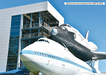 У въезда в Центр – Plaza Pirmstrong: большая парковка для автомобилей и транспортный самолет NASA 905 с закрепленном наверху фюзеляжа космическим кораблем «Шаттл».