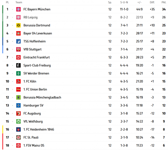 12-й тур несколько перетасовал колоду преследователей лидера (если их ещё можно назвать преследователями) и колоду обитателей «подвала». Положение единоличного лидера упрочилось ещё больше – правда, аутсайдер, «Санкт-Паули», изрядно потрепал нервы поклонникам «Баварии».