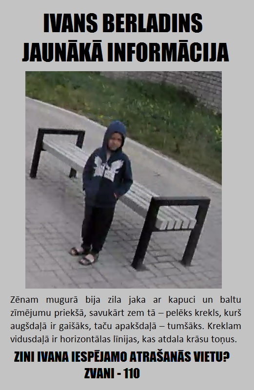 Людей, у которых есть любая информация об обстоятельствах пропажи маленького Ивана, и людях, которые могут быть к этому причастны, просим информировать полицию.. А также сообщать, если вы сами стали в Лиепае свидетелями событий, которые вам показались странными, но которым поначалу вы не придали значения. . Любая мелочь сейчас может стать недостающим звеном в цепочке следствия.