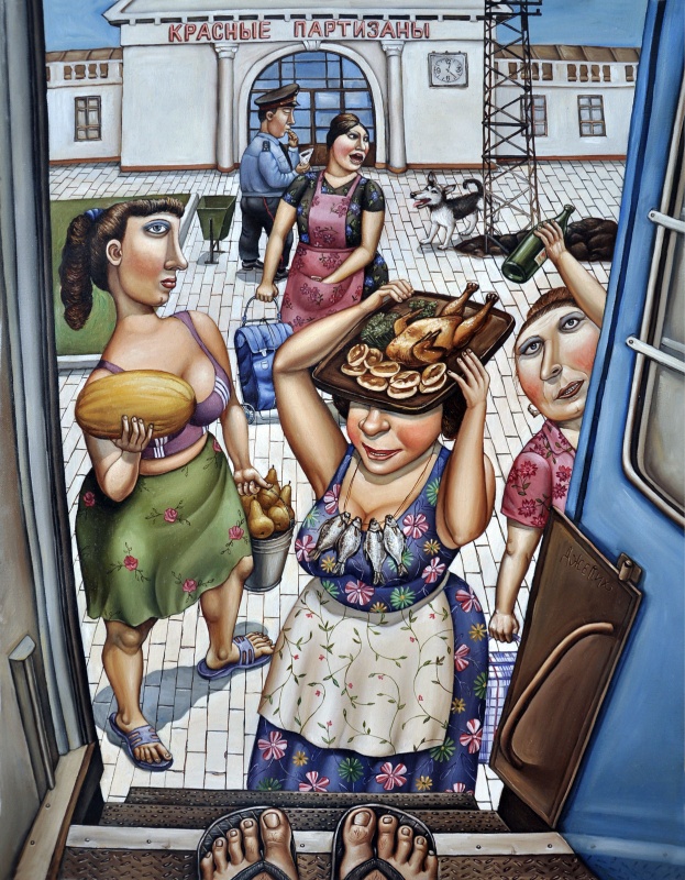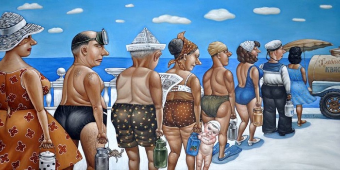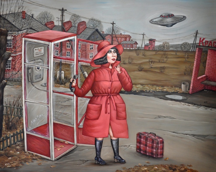Про что картинки? Про СССР. «Путешествие в СССР» - название серии. Но художница не просто рисует ностальгические «советские» картины: толстущие мечтательные дамочки, неуклюжие кавалеры, пионеры и бабушки на лавочках у подъездов. Она любит эти реалии советской эпохи, наслаждается ими, но, конечно, переосмысливает их и делает это с совершенно потрясающим чувством юмором.