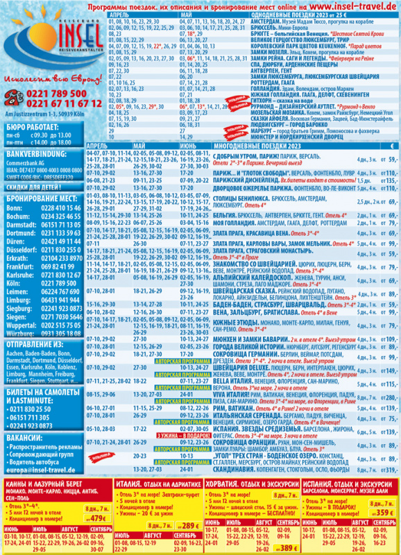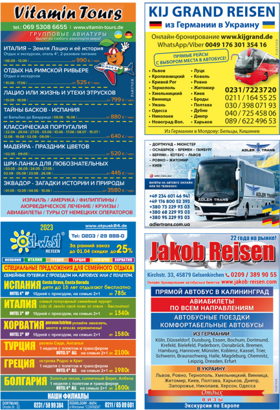 (предложения Reisebüro, курорты, авиаперелеты, ж/д- и автобусные перевозки)