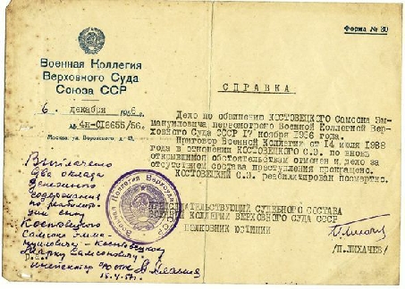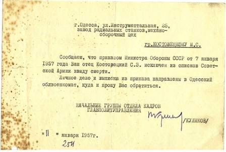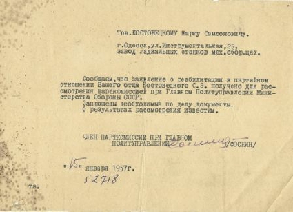 Если бы не крохотная запись на приглашении, сделанная рукой отца, я бы никогда не узнал, что это и есть тот документ по факту, который  подтверждает восстановленное честное имя коммуниста Самсона Костовецкого. А вот и сама запись: „Парткомиссией при главном политупр. МО СССР  от 20.03.57г. Протокол № 21“ (Фото12).