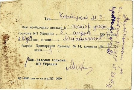И совсем маленький, почти незаметный клочок бумаги. Приглашение в Одесский горком партии в сектор учёта от 5 июля 1957года (фото11).