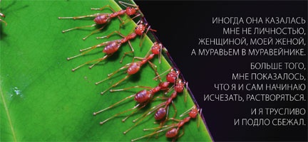 Иногда она казалась мне не личностью, женщиной, моей женой, а муравьем в муравейнике. Больше того, мне показалось, что я и сам начинаю исчезать, растворяться. И я трусливо и подло сбежал.