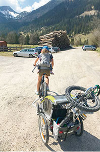Одним из наших главных помощников с появлением второго ребенка стал электровелосипед, без которого многие маршруты были бы для нас недоступны из-за их отдаленности. На велосипед установлено одно детское сидение и прицеп, на который мы ещё навешиваем небольшой велосипед для старшего сына и рюкзак. Всего на электровелосипеде я могу везти до 50 кг дополнительного груза.