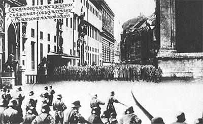 Первый заслон на пути национал-социалистов. Первый бой с ними. Первые жертвы. Замертво упали на мостовую четыре полицейских и 16 демонстрантов. Геринг валится с прострелянным бедром.