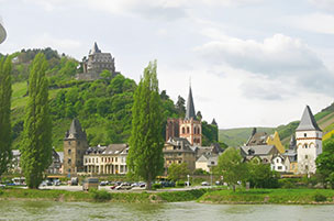Чтобы покинуть вокзал, надо на прозрачном лифте подняться на мост над ж.д. путями. С его высоты можно оглядеть почти весь город: главную улицу, возвышенность с виноградниками и с замком Stahleck, Рейн.